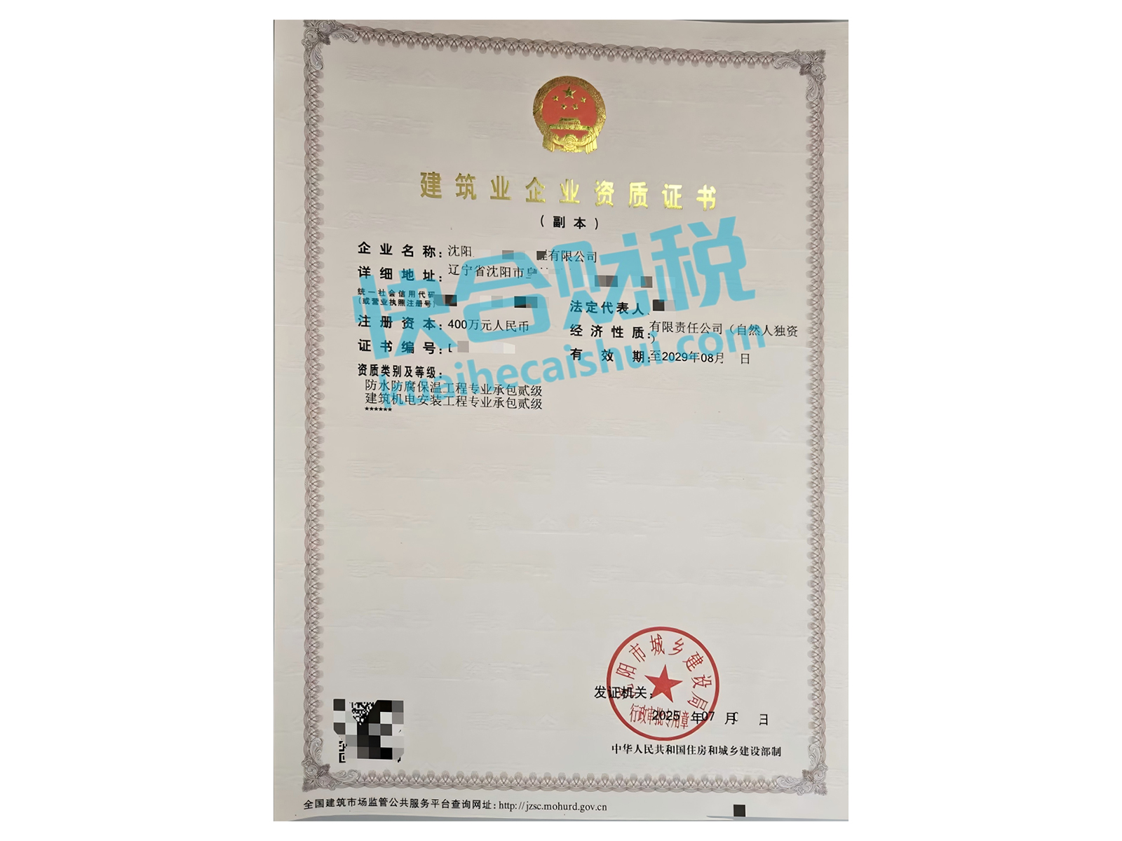 消防设施工程专业承包贰级、防水防腐保温工程专业承包贰级、建筑机电安装工程专业承包贰级